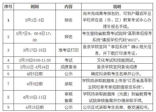 报考方式:考生自行登录江西省教育考试院网站(网址:www.jxeea.cn)“高职单招报考系统”,按照网页提示的流程操作,选报我院院校代码8603,选择不超过5个专业和是否服从专业调剂。